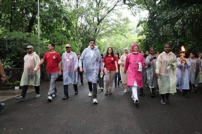 Didi Krishna Kumari, Head of the Sadhu Vaswani Mission, formally inaugurated the walk by sharing her wisdom with all present. To help participants experience the walk as an inner journey, she conducted a brief activity demonstrating the impact of holding onto grudges. This was followed by a short forgiveness meditation, allowing everyone to begin the walk with calm and open hearts. “Suppression, expression, and holding on create havoc within us,” she shared. “Identifying what must be released—and letting it go—is the key to inner peace.” With these words, Didi Krishna Kumari lit the torch and flagged off the walkathon. She then led the participants by walking the entire route herself, setting a powerful example of presence and purpose.
