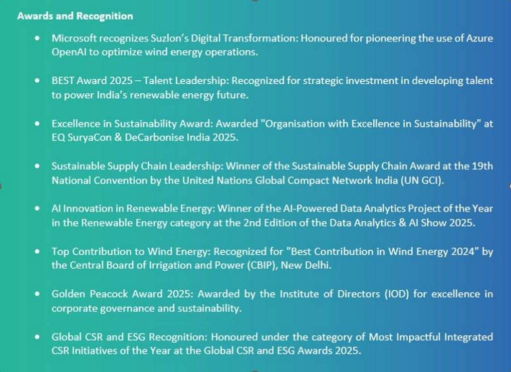 JP Chalasani, Chief Executive Officer, Suzlon Group, said, “This year, we completed Suzlon’s ramp-up phase, which is reflected in the sharp increase in our deliveries. With our highest-ever firm order book of 5.6 GW, we have long-term visibility and the capacity to scale and support future growth. These efforts have built a solid foundation to meet India’s rising need for clean, reliable, and locally made wind energy. Our continued focus on safety, quality, ESG, and customer satisfaction will guide us as we step into the next phase of India’s energy journey.”