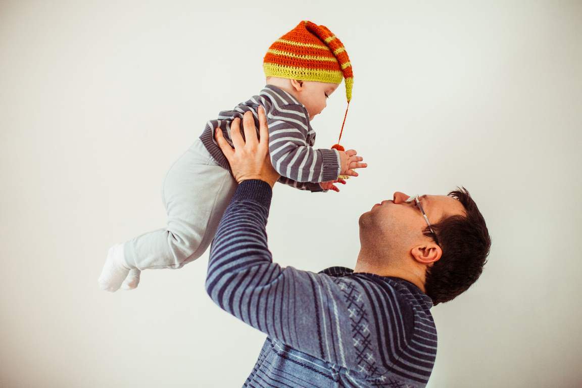 Father holds tender little son in stripped hat