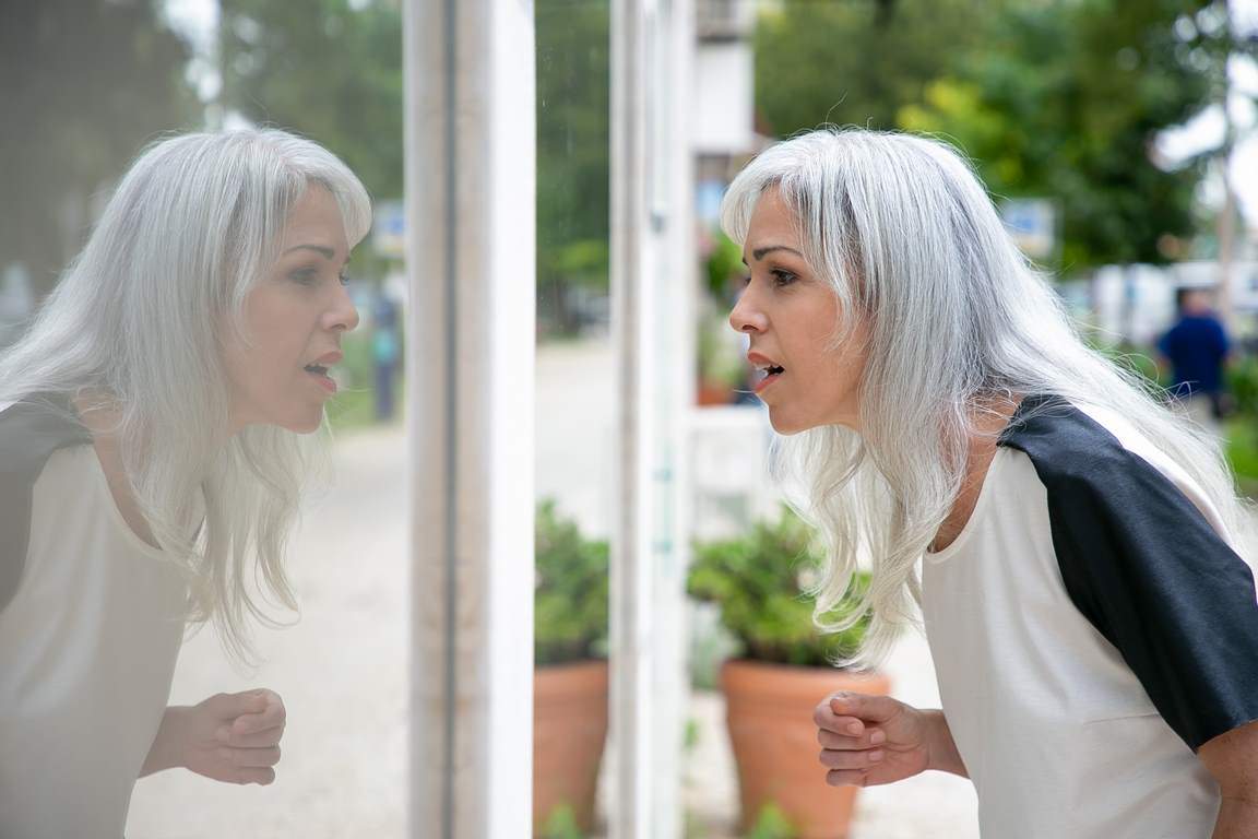 Excited female shopaholic staring at shop window with open mouth, standing at store outside. Side view. Window shopping concept
