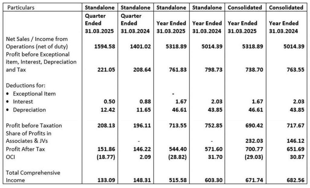 For the year ended 31st March 2025, the consolidated results reflect net sales of Rs 5318.9 Cr as against Rs 5014.4 Cr in the previous year and Profit After Taxes of Rs 700.8 Cr as against Rs 651.7 Cr in the previous year.